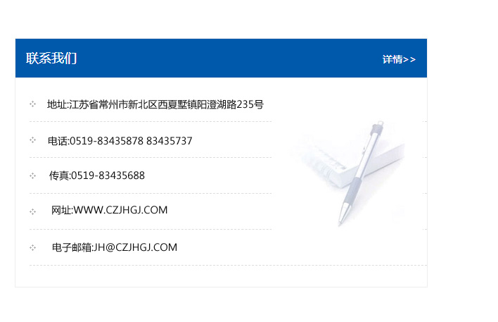 地址:常州市新北區友邦商務大廈1幢16、17層  電話:0519-85101652  傳真:0519-85112595  郵編:213022  網址:www_cz-jiayue_cn.aoweiyadz.com  郵箱:xiajifengaa@163.com